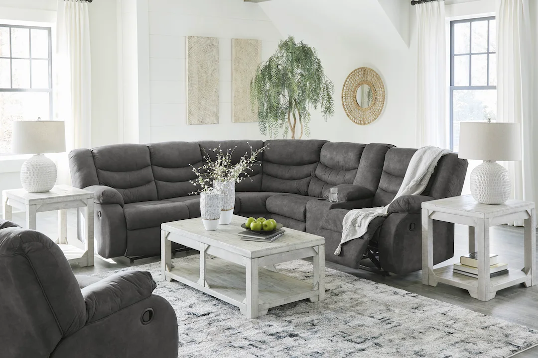 The Partymate 2-Piece Manual Reclining Sectional with Console is perfect for movie nights or relaxing with a book. It features manual reclining mechanisms, allowing you to adjust your seating position with ease. The console provides handy cup holders and storage for your essentials, making it as practical as it is comfortable.
